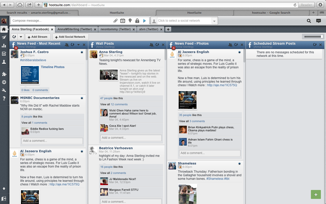 I've used TweetDeck for awhile now to organize my social media presence, but I wanted to try something different. I signed up for an account on HootSuite and, right away, I noticed the difference. HootSuite allows for a more engaged and in-depth level of organization than TweetDeck.